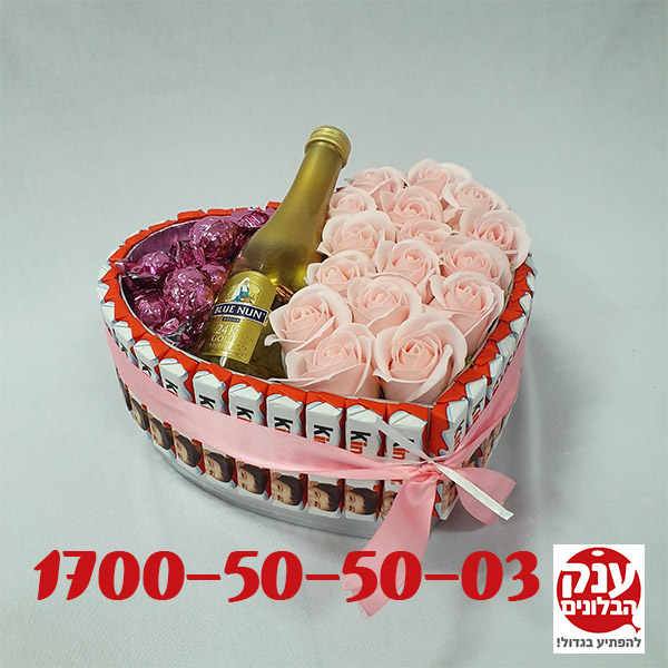פרחים בקוספא בצורת לב בעיצוב מדהים ומרגש שמגיע עם שלל שוקולד קינדר בשילוב בקבוק BLUE NUNE ופרלינים של שוקולד והכי חשוב פרחים מלאכותיים להשלמת העיצוב המדהים רוצה לרגש ליום אהבה ? או ליום הולדת ? המתנה המושלמת והמרגשת שתהפוך כל אחת לנסיכה ליום אחד .