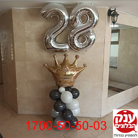 בלונים ליום הולדת 28 חוגגים עם ענק הבלונים ,עיצוב בלונים בשילוב בלון כתר מרשים במיוחד ובלוני מספרים מנופחים בהליום לציון הגיל .