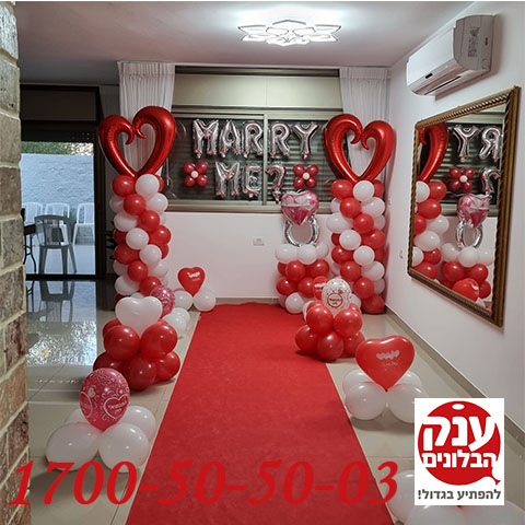 בא לכם הצעת נישואין ? רוצים משהו מיוחד במחיר מיוחד ? הצעה המושלמת שתגרום לכם להנות להתרגש ביום הכי מיוחד שלכם במחיר הכי זול שיש הצעה כוללת שביל אדום בשילוב מעמדי בלונים אותיות MARRY ME ושני זוג סטנד ענקים עם בלוני לבבות .