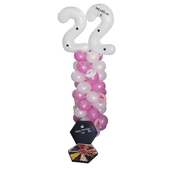 מתנה למי שאנחנו הכי אוהבים מגש גומי שמגיע עם שוקולדים וגומי בשילוב הדפסה אישית סטנד בלונים בצבעים לפי הבחירה שלכם עם זוג בלוני מספרים צבע לבן עם כיתוב אישי .